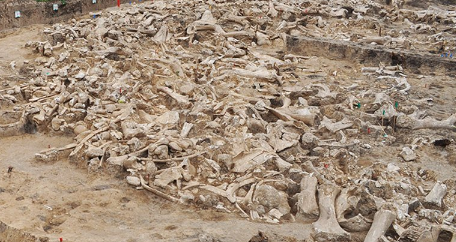最古老的連續(xù)骨圈直徑為12.5米(41英尺),幾乎完全由猛mm骨頭以及少量馴鹿,馬,熊,狼,赤狐和北極狐制成的骨頭組成;考古學(xué)家從猛mm象中發(fā)現(xiàn)了總共51個下頜和64個單獨的頭骨。