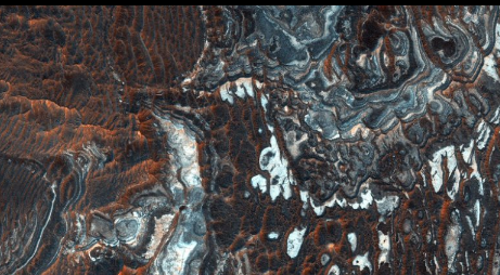 這在相鄰地形的HiRISE捕捉的另一張圖像中(如下所示)更加清楚了,這些補(bǔ)丁覆蓋了圖像左半部分的三分之二。