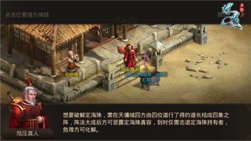 在祖師的指點下你前往曹寶處求借落寶金錢以克制定海珠,不想曹寶在獲得驚妖鈴后已經(jīng)將落寶金錢交由蕭升保管,而蕭升恰巧受邀去了天界,你只好尋求陸壓真人的幫助,得知只有在找四位得道前輩組成四象之陣阻擋四海之水并使定海珠現(xiàn)出原形,到時只需擒下偷走定海珠的賊人,并控制住定海珠即可化解危難。