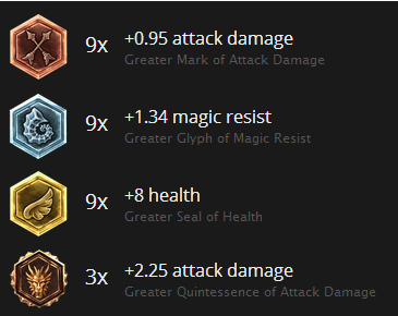 同樣的,你需要魔抗。之后,就看你的需要選擇了。魔抗雕紋很適合早期游戲(如果跟你對(duì)線的是吸血鬼、伊莉絲和蘭博等英雄。成長(zhǎng)魔抗雕紋則適合后期游戲(在上單位置,成長(zhǎng)魔抗雕紋是相當(dāng)好的因?yàn)檫@是一條solo的線所以你會(huì)更快的18級(jí),并且你經(jīng)常和AD英雄對(duì)線)。