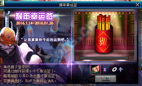 角色首次登陸時可獲得1個幸運簽,使用后可隨機獲得Buff,幸運簽可以在GSD處購買