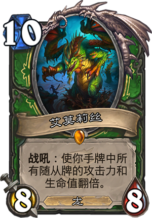 傳說隨從艾莫莉絲(暫譯),10費8-8,龍,戰(zhàn)吼:使你手牌中所有隨從的攻擊力和血量翻倍。