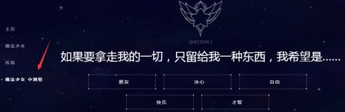 首先如圖進去領(lǐng)取地址-然后魔法少女小測試如圖所示,反正會給一些列有的沒得的測試,選擇不同的答案就會有不同的測試結(jié)果,最后的結(jié)果肯定是根據(jù)答案分別是拉克絲、金克絲、風女、波比、露露咯。(小編隨便瞎點的,最后測試結(jié)果是拉克絲,所以你想要別的就多試試就此多試試幾次。)