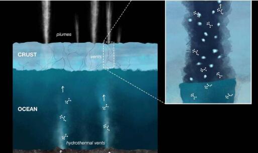 宇航局宣布,在土星衛(wèi)星土衛(wèi)二噴出的冰羽中檢測到了新的有機(jī)化合物,它們是氨基酸的成分。月球有強(qiáng)大的熱液噴口,可以噴射出行星核心的物質(zhì),這些物質(zhì)與月球巨大的地下海洋中的水混合。
