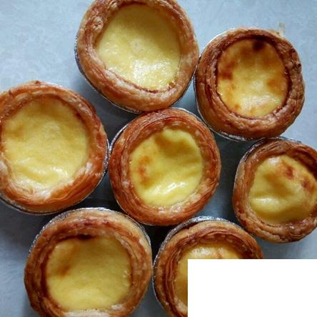 5、烤箱200度預(yù)熱十分鐘,將蛋撻放入預(yù)熱好的烤箱中,中層,200度,上下火,約20分鐘左右,烤至撻皮呈金黃色,蛋撻中有焦黃色點(diǎn)即可取出。