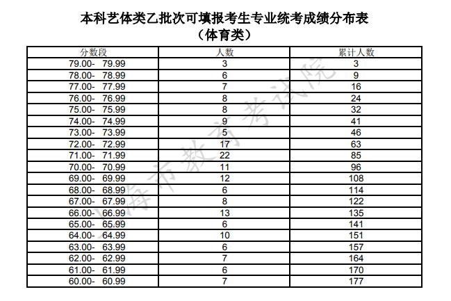 2021年上海市本科藝體類乙批次可以填報(bào)志愿的考生成績(jī)分布表已經(jīng)發(fā)布,下面是體育類統(tǒng)考成績(jī)的統(tǒng)計(jì)表,一起來(lái)看吧!
