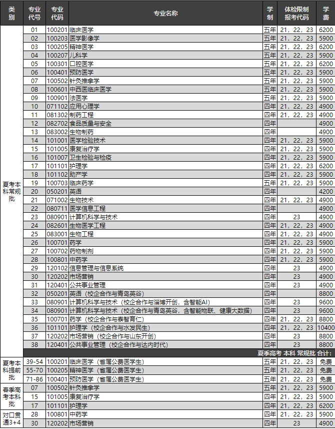 濟寧醫(yī)學(xué)院夏季本科常規(guī)批一般 類專業(yè)學(xué)費為4900-6200元/年,校企合作專業(yè)8800元/年(其中護(hù)理學(xué)10400元/年,計算機科學(xué)與技術(shù)9600元/年),夏季高考省屬公費醫(yī)學(xué)生學(xué)費免費,本科批5900-6200元/年,對口貫穿專業(yè)學(xué)費為4900-5900元/年。