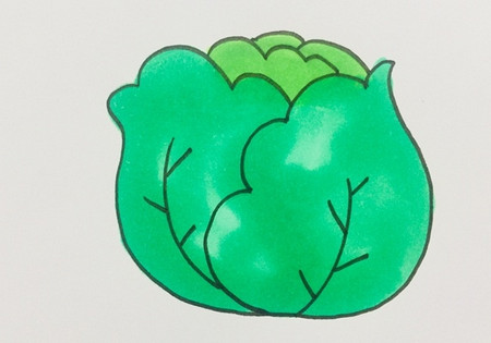 最后,卷心菜被漆成綠色。外面的兩片葉子和里面的兩片葉子可以使用不同深淺的綠色,里面是嫩綠色,外面是較暗的綠色。畫一顆簡單可愛的白菜就行了。