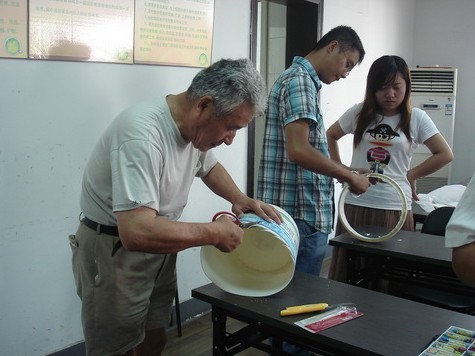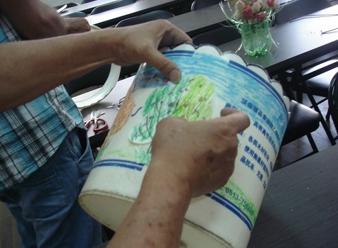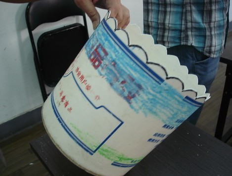 將預(yù)先繪制和切割的圖案粘在桶上。