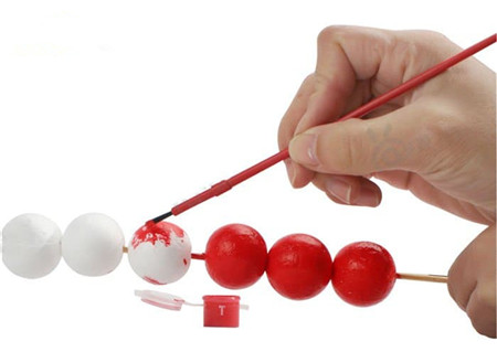 用紅色顏料刷泡沫球,注意顏料較厚,確保泡沫球被紅色顏料覆蓋。