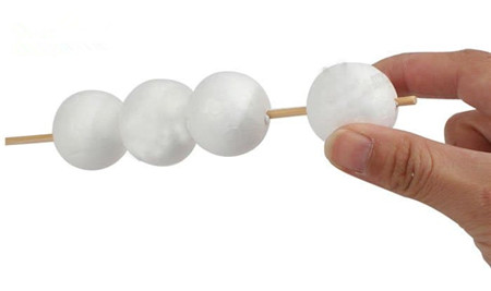準(zhǔn)備五個同樣大小的泡沫球,用竹簽串起來。