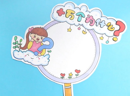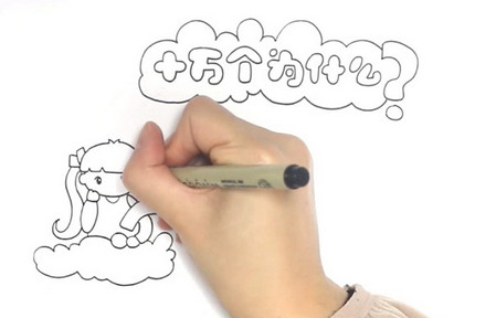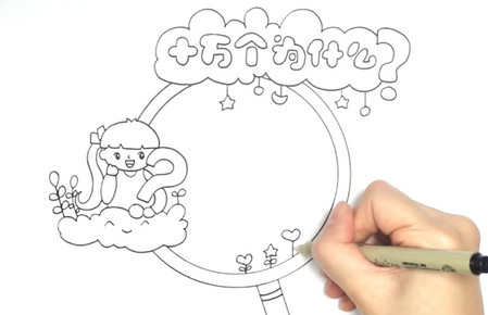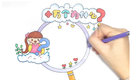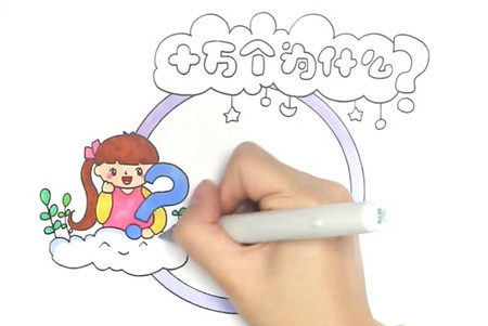 首先在圖片上方寫上閱讀卡的標(biāo)題“十萬個(gè)為什么”,在標(biāo)題上畫一個(gè)云形邊框,加上一個(gè)小問號,在圖片左下角畫一個(gè)帶問號的小女孩。