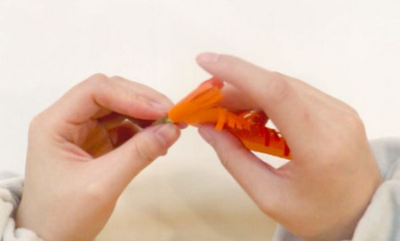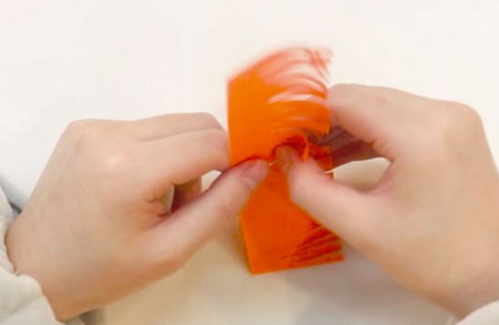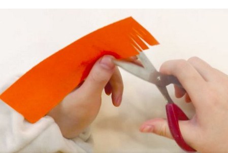 拿一個長長的橙色折紙,把一端切成細(xì)條。