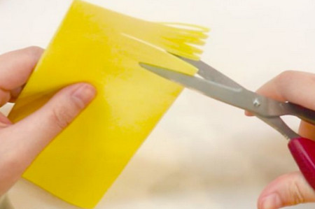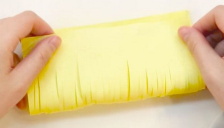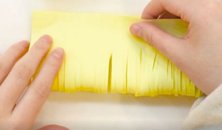取一張黃色折紙,對折,中間部分切成細(xì)條。