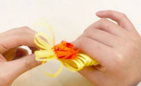 把切好的折紙貼在雄蕊周圍,做成菊花花瓣。