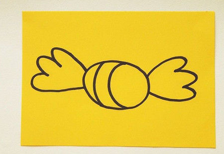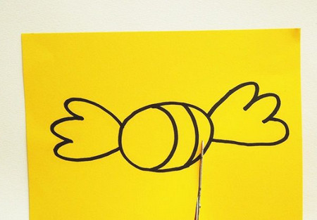 在紙上畫(huà)一個(gè)糖果,先畫(huà)一個(gè)橢圓形,然后在兩邊畫(huà)小翅膀形狀的糖果紙,在橢圓形的糖果顏色上畫(huà)一個(gè)圖案。