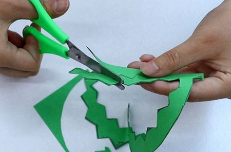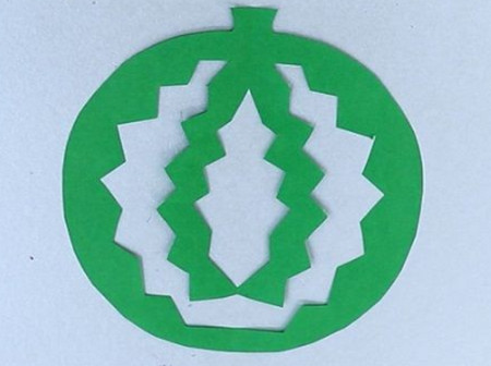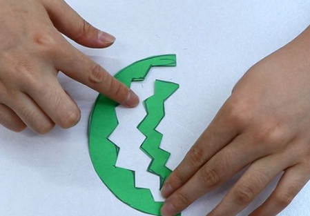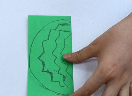 然后用剪刀從西瓜梗上剪下,根據(jù)畫出的線條剪出西瓜的基本輪廓。然后沿著折疊邊緣線小心地剪下西瓜線。