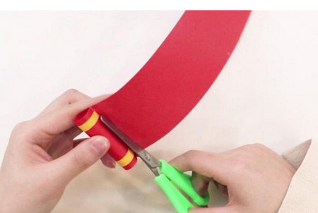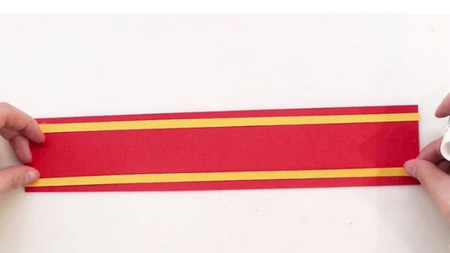 首先準(zhǔn)備一張紅色的長彩紙,在彩紙的兩面貼上黃色的長條。