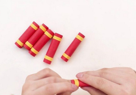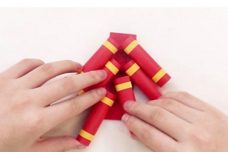 找一張紅紙,把準(zhǔn)備好的鞭炮依次貼在上面,這樣就會(huì)有一串鞭炮了!