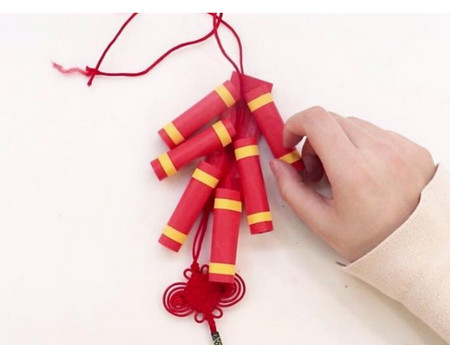 找一根紅繩和一個(gè)中國結(jié),把鞭炮底部的中國結(jié)串聯(lián)起來,手工鞭炮就完成了!
