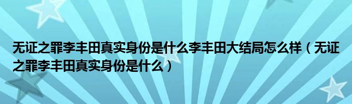大家好,小育來(lái)為大家講解下。無(wú)證之罪李豐田真實(shí)身份是什么李豐田大結(jié)局怎么樣,無(wú)證之罪李豐田真實(shí)身份是什么很多人還不知道,現(xiàn)在讓我們一起來(lái)看看吧!