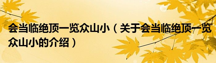 摘要大家好,小新來(lái)為大家解答以上的問(wèn)題。會(huì)當(dāng)臨絕頂一覽眾山小,關(guān)于會(huì)當(dāng)臨絕頂一覽眾山小的介紹很多人還不知道,現(xiàn)在讓我們一起來(lái)看看吧!1