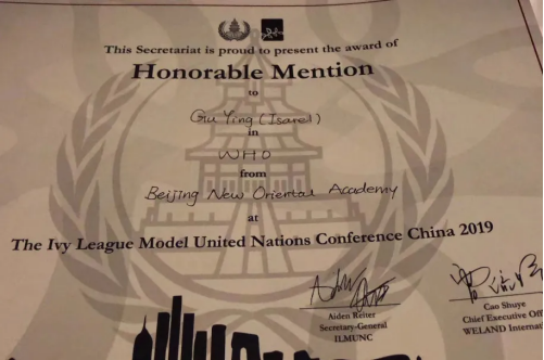 顧瀅的多元文化成長模式,不僅僅讓她在多語言學習過程中如魚得水,在豐富的社會活動中也展現(xiàn)得淋漓盡致,她在十年級加入了學校的模擬聯(lián)合國社團,第一次參加常青藤模聯(lián)大會中國會議就收獲頗豐。