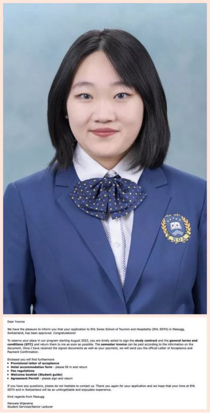 顧瀅在純正的英文環(huán)境中持續(xù)突破自我,在中外籍教師的支持下,她的英語水平突飛猛進,當她與酒店管理專業(yè)世界排名第一的瑞士洛桑酒店管理學院面試官進行交流時,自信滿滿,最終收獲了夢校的offer。