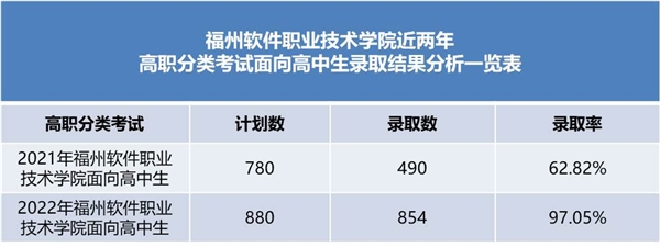 2022年,福軟高職分類面向高中計(jì)劃錄取880人,相較于2021年,增加100人;福軟錄取總?cè)藬?shù)為854人,較2021年增加364人;福軟在該類招生錄取率為97.05%,同比增長34.23%。