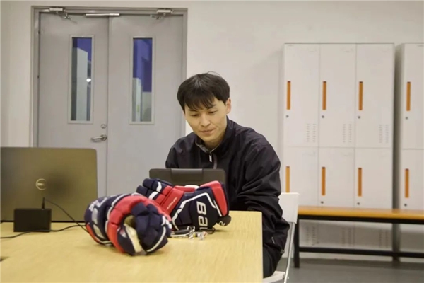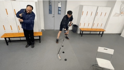 冰球課上,同學們正在跟著教練練習如何精準的控制力量,將對身體和手腕的控制轉(zhuǎn)移至球桿上,并進行精準擊球。