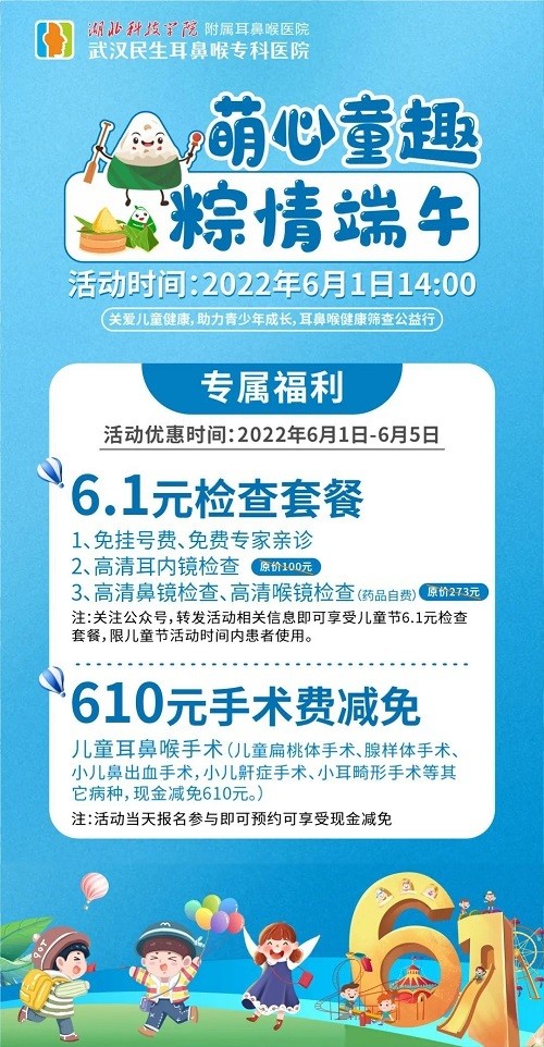 每年的農(nóng)歷五月初五,是我國(guó)的傳統(tǒng)節(jié)日端午節(jié),為繁榮、弘揚(yáng)中華文化,武漢民生耳鼻喉專(zhuān)科醫(yī)院精心為小朋友們策劃了【萌心童趣·粽情端午】線(xiàn)下聯(lián)歡會(huì),精美禮品等你拿喲~