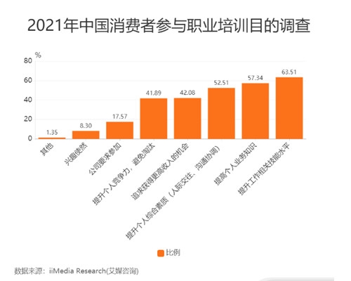相比于普通教育,職業(yè)教育更加注重實踐技能和實際工作能力的培養(yǎng)。當(dāng)前社會競爭環(huán)境的日趨激烈,促進(jìn)人們持續(xù)學(xué)習(xí)的意愿更加強(qiáng)烈。根據(jù)艾媒咨詢的數(shù)據(jù)顯示,2021年63.51%消費(fèi)者參與職業(yè)培訓(xùn)的目的是提升工作相關(guān)技能水平;大部分職場人士看中的在線培訓(xùn)訴求為職業(yè)技能,占比57.4%;29.1%的職場人士想要獲得證書。