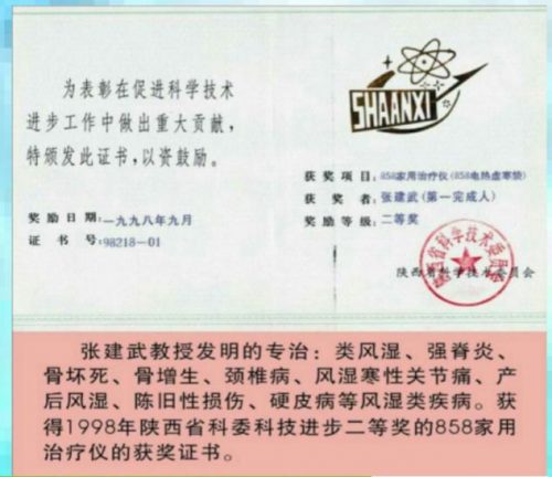 ⑤1990年(30歲)在國內(nèi)首創(chuàng)研制的“858風(fēng)濕理療儀及理效藥液”治療風(fēng)濕類疾病療效顯著,獲陜西省科委科技進(jìn)步二等獎(jiǎng),全國消費(fèi)者信得過產(chǎn)品獎(jiǎng)。