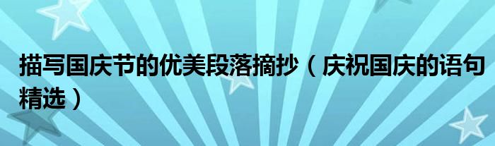大家好,小高來(lái)為大家解答以上問(wèn)題。描寫(xiě)國(guó)慶節(jié)的優(yōu)美段落摘抄,慶祝國(guó)慶的語(yǔ)句精選很多人還不知道,現(xiàn)在讓我們一起來(lái)看看吧!