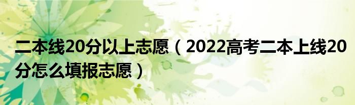 大家好,小高來為大家解答以上問題。二本線20分以上志愿,2022高考二本上線20分怎么填報志愿很多人還不知道,現(xiàn)在讓我們一起來看看吧!