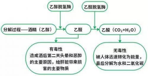 人一旦飲酒,酒精進(jìn)入血液后,就被輸送至肝臟。肝臟中的乙醇脫氫酶使乙醇轉(zhuǎn)化為乙醛,乙醛被乙醛脫氫酶轉(zhuǎn)化為乙酸。乙酸再被肝藥酶(細(xì)胞色素P450)徹底轉(zhuǎn)化為二氧化碳和水排出體外。