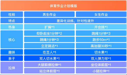 “方案”針對不同年級、不同性別設(shè)置為期8周的體育作業(yè)模板,項目包含跳繩、深蹲、仰臥”等上百種AI運動作業(yè)項目;針對不同年級水平設(shè)計了每周競速賽、每月團(tuán)隊賽,“以賽代練”,增強學(xué)生運動能力和團(tuán)隊榮譽感;設(shè)計了4大類專項精品課,讓學(xué)生通過“理論+實踐”的深度學(xué)習(xí)方式真正掌握一項運動技能。