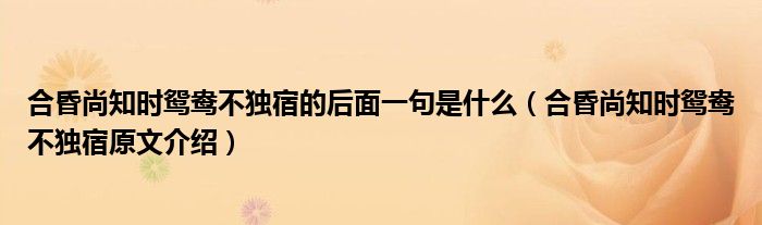 大家好,伊人來(lái)為大家解答以上問(wèn)題。合昏尚知時(shí)鴛鴦不獨(dú)宿的后面一句是什么,合昏尚知時(shí)鴛鴦不獨(dú)宿原文介紹很多人還不知道,現(xiàn)在讓我們一起來(lái)看看吧!