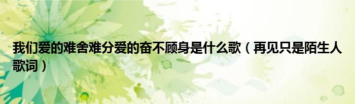 大家好,伊人來(lái)為大家解答以上問(wèn)題。我們愛(ài)的難舍難分愛(ài)的奮不顧身是什么歌,再見(jiàn)只是陌生人歌詞很多人還不知道,現(xiàn)在讓我們一起來(lái)看看吧!