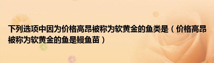 大家好,伊人來(lái)為大家解答以上問(wèn)題。下列選項(xiàng)中因?yàn)閮r(jià)格高昂被稱為軟黃金的魚(yú)類是,價(jià)格高昂被稱為軟黃金的魚(yú)是鰻魚(yú)苗很多人還不知道,現(xiàn)在讓我們一起來(lái)看看吧!