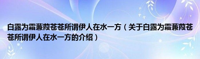 大家好,小新來為大家解答以上的問題。白露為霜蒹葭蒼蒼所謂伊人在水一方,關(guān)于白露為霜蒹葭蒼蒼所謂伊人在水一方的介紹很多人還不知道,現(xiàn)在讓我們一起來看看吧!